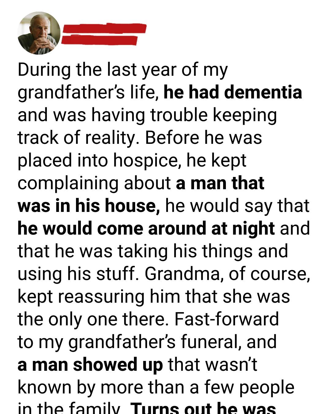 His doctor, convinced that his mind was simply slipping deeper into confusion, increased his medications, hoping to help him stay grounded. But no matter what they gave him, the stories about the “man in the house” never stopped. Fast-forward to my grandfather’s funeral.