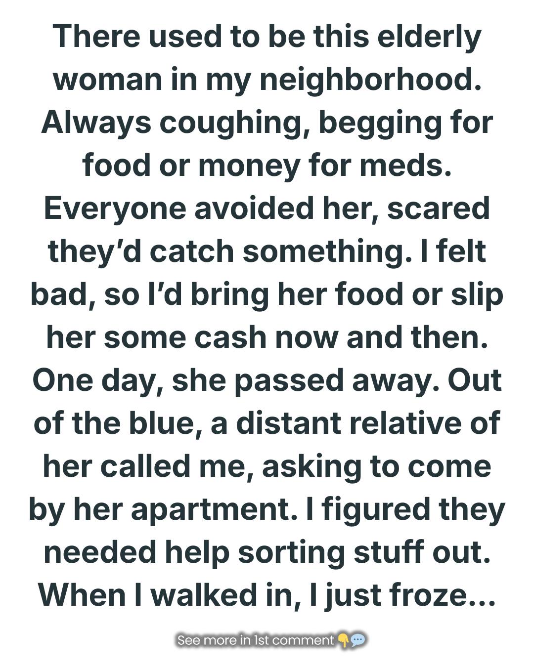 He asked if I could come to her apartment. I figured they needed help sorting through her things, maybe donating what little she had. But when I stepped inside, I just stopped cold.