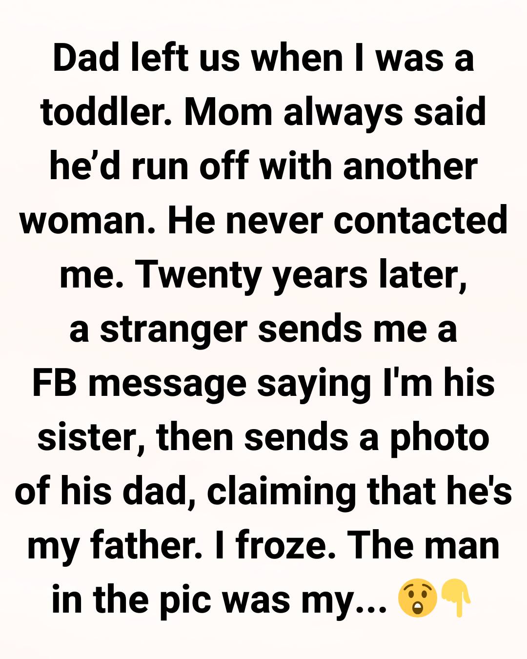 Dad left us when I was a toddler. At least, that’s what I grew up believing. Mom always said he’d run off with another woman, abandoning us without a backward glance.