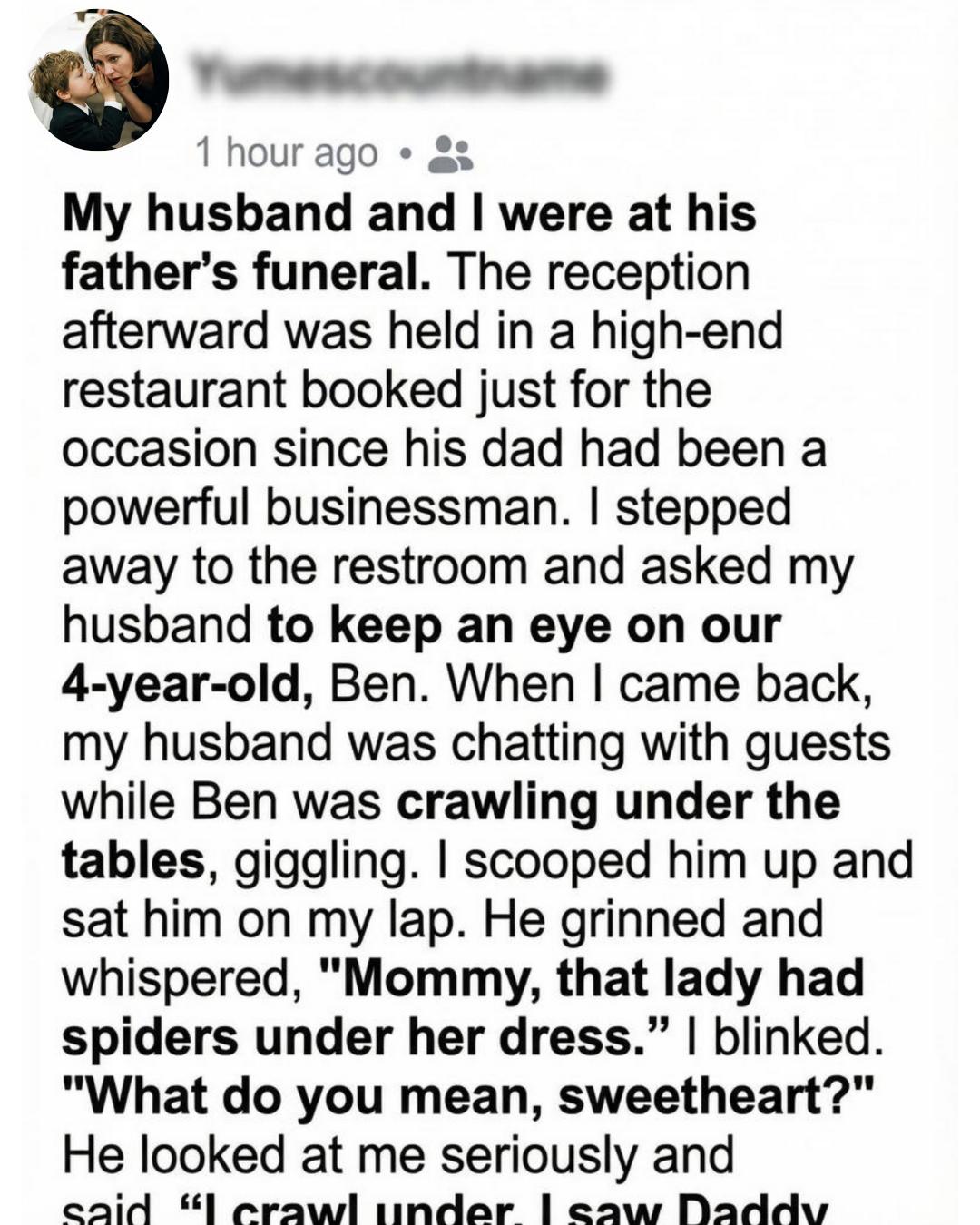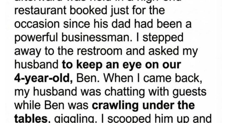 While the adults in the reception hall murmured condolences over half-empty cups of lukewarm coffee, my four-year-old son, Ben, crawled under the banquet tables, blissfully unaware of the tangled grief and tension hanging in the air. But when he popped back up a moment later, something in his face had changed. He tugged softly at the hem of my black dress, leaned in close, and whispered words so simple yet so shattering: