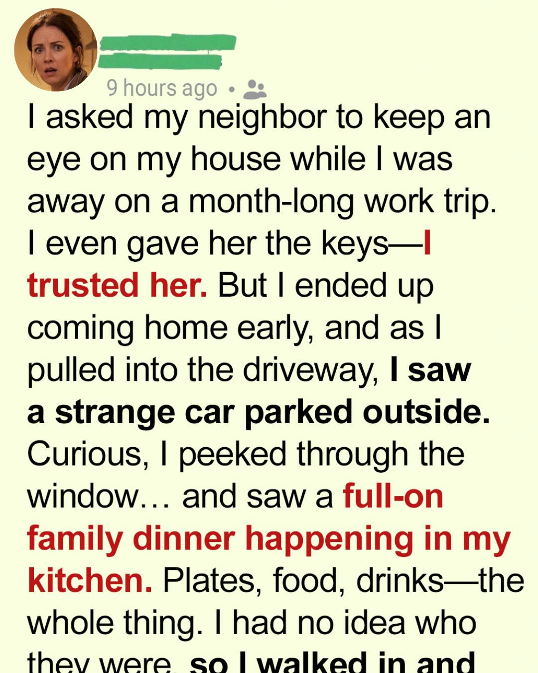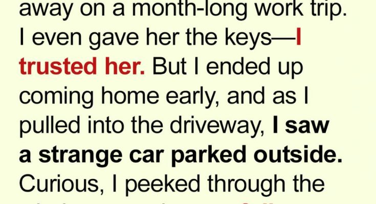 Leaving my luggage in the car, I carefully approached my house. Through the sheer kitchen curtains, I saw something that made my heart nearly stop. A family was eating dinner at my kitchen table— a man carving a chicken, a woman pouring wine, and two kids laughing as they ate.