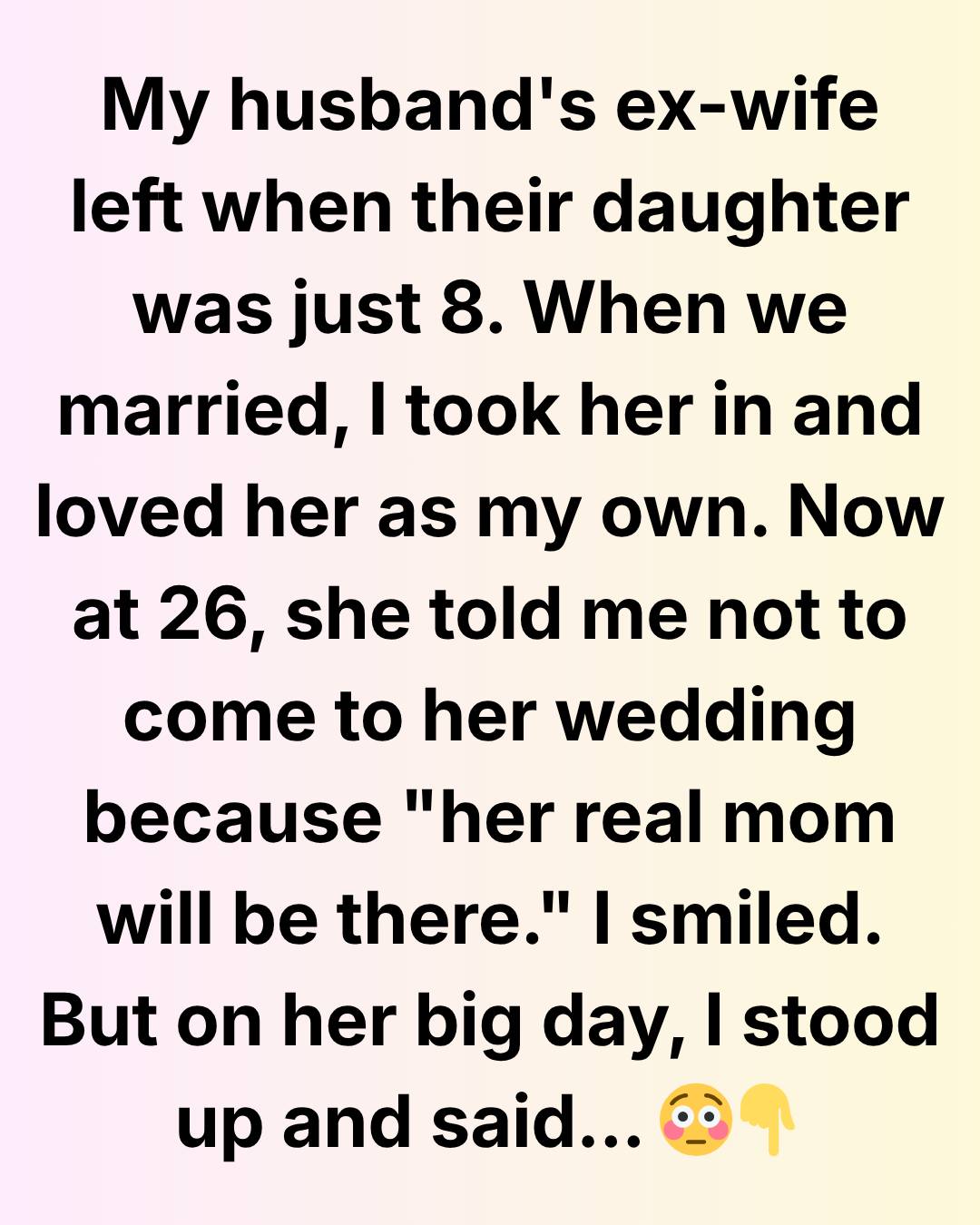 But then, completely out of the blue, she quietly told me she didn’t want me to attend. Her explanation was simple but harsh: “My real mom will be there. She won’t feel comfortable around you.”