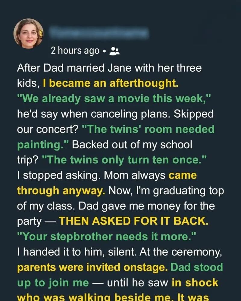 “It’s not all about you anymore,” he said, like I should be ashamed for wanting a place in his life! Mom, on the other hand, never wavered! She was my fortress, working double shifts, bringing me late-night snacks during study marathons, and clapping louder than anyone at my school plays!