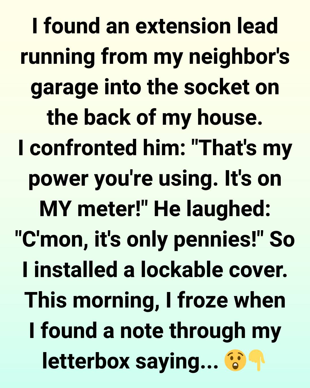 I just stood there in my hallway, note in hand, absolutely frozen. I’m not trying to cause a neighborhood war. I even offered a reasonable solution—told him I’d go halves on getting a sparky to fit an outdoor socket on his own wall.