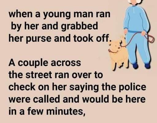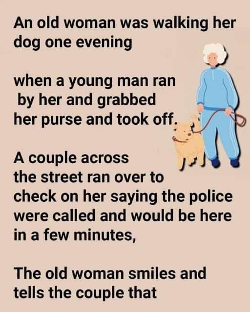 One evening, an old woman was walking her dog when a young man ran by her, grabbed her purse, and took off. A couple across the street ran over to check on her saying the police were called and would be there in a few minutes. The old woman smiles and tells the couple it’s not a big deal.