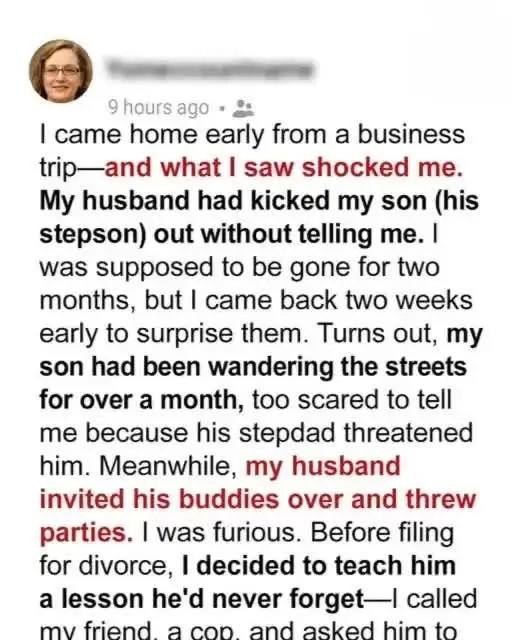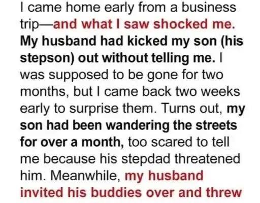 I thought I knew the man I married—calm, dependable, and steady. But everything I believed shattered the day I came home early. Travis had kicked my 17-year-old son, Caleb, out of the house while I was gone.