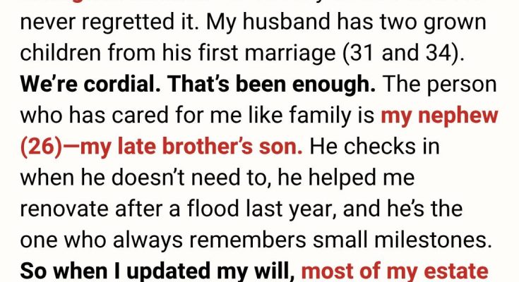 So—when I sat with my lawyer to redo my will, my choices reflected the life I’d actually lived. I left most of my estate to the person who showed up. My husband knew.