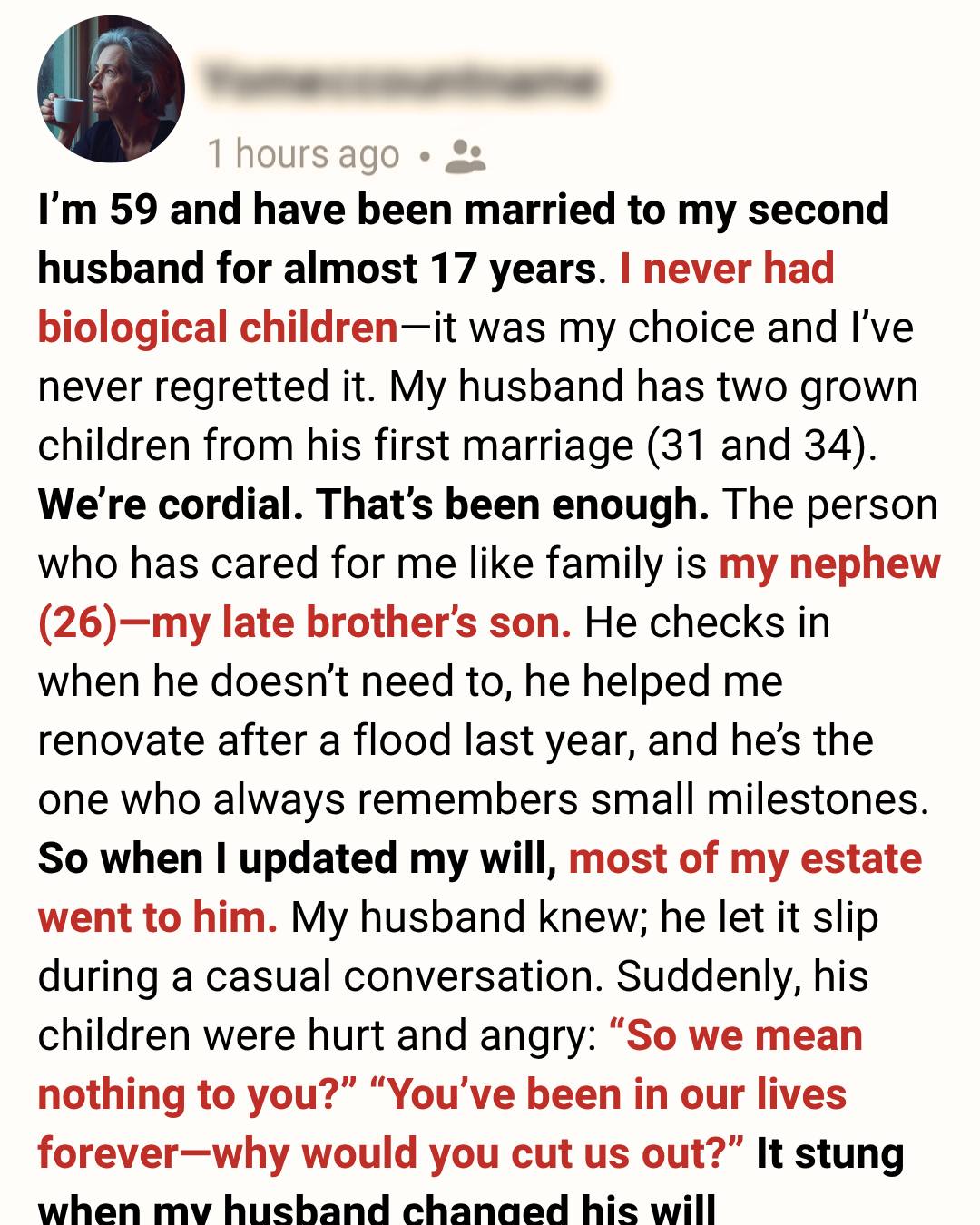 He came with a life, a history, and two adult children who are now 31 and 34. My relationship with them has always been polite and respectful. We are not close.