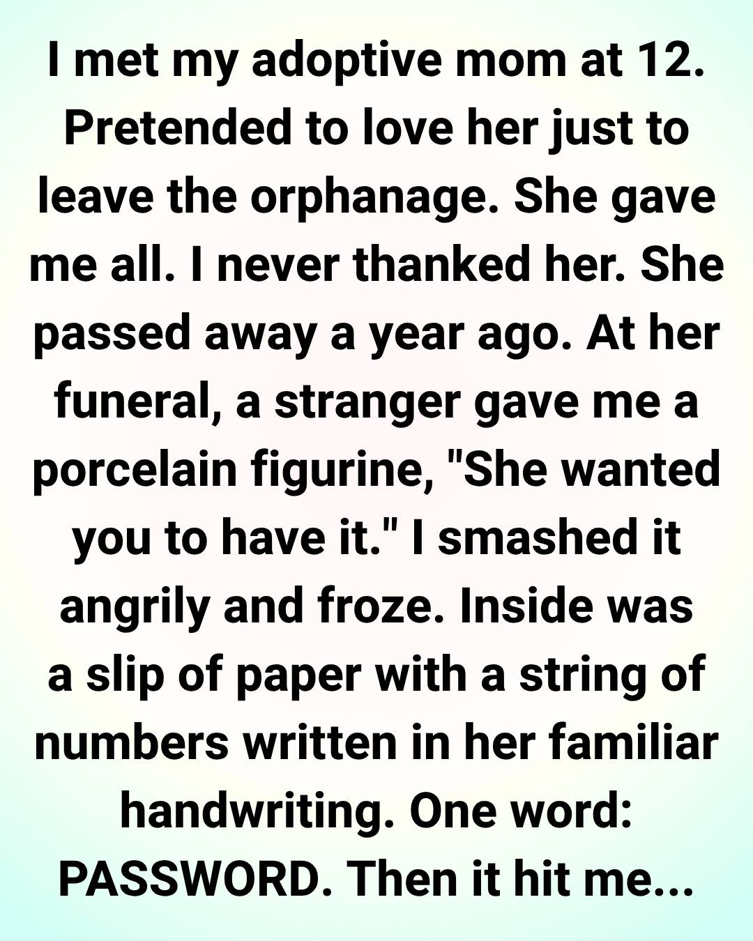 It was her handwriting. A series of numbers, followed by one word: PASSWORD. I remembered her once mentioning a bank account, but I’d brushed it off.