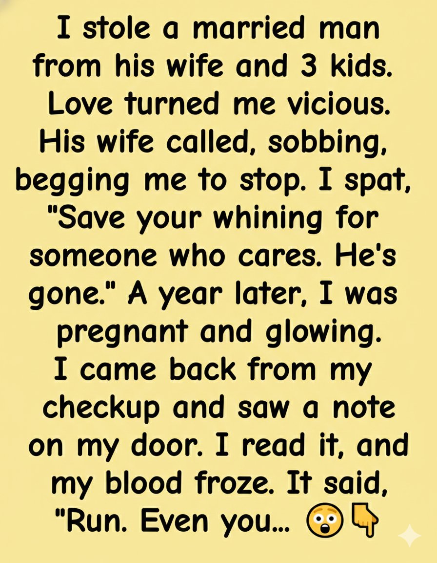 That afternoon, I came home from a routine checkup, one hand resting on my belly, the other holding ultrasound photos. That’s when I saw the note taped to my door. Run.