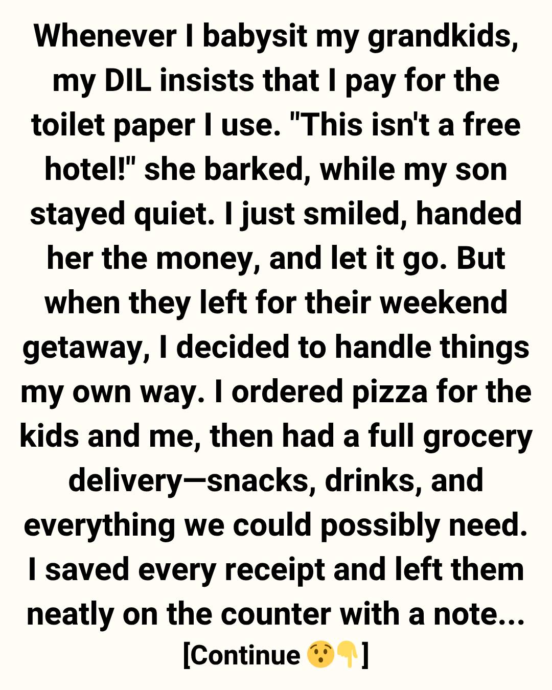 Whenever I babysit my grandkids, my daughter-in-law insists that I pay for the toilet paper I use. “This isn’t a free hotel!” she snapped once, while my son stood by, silent. I just smiled, handed her the money, and let it go.