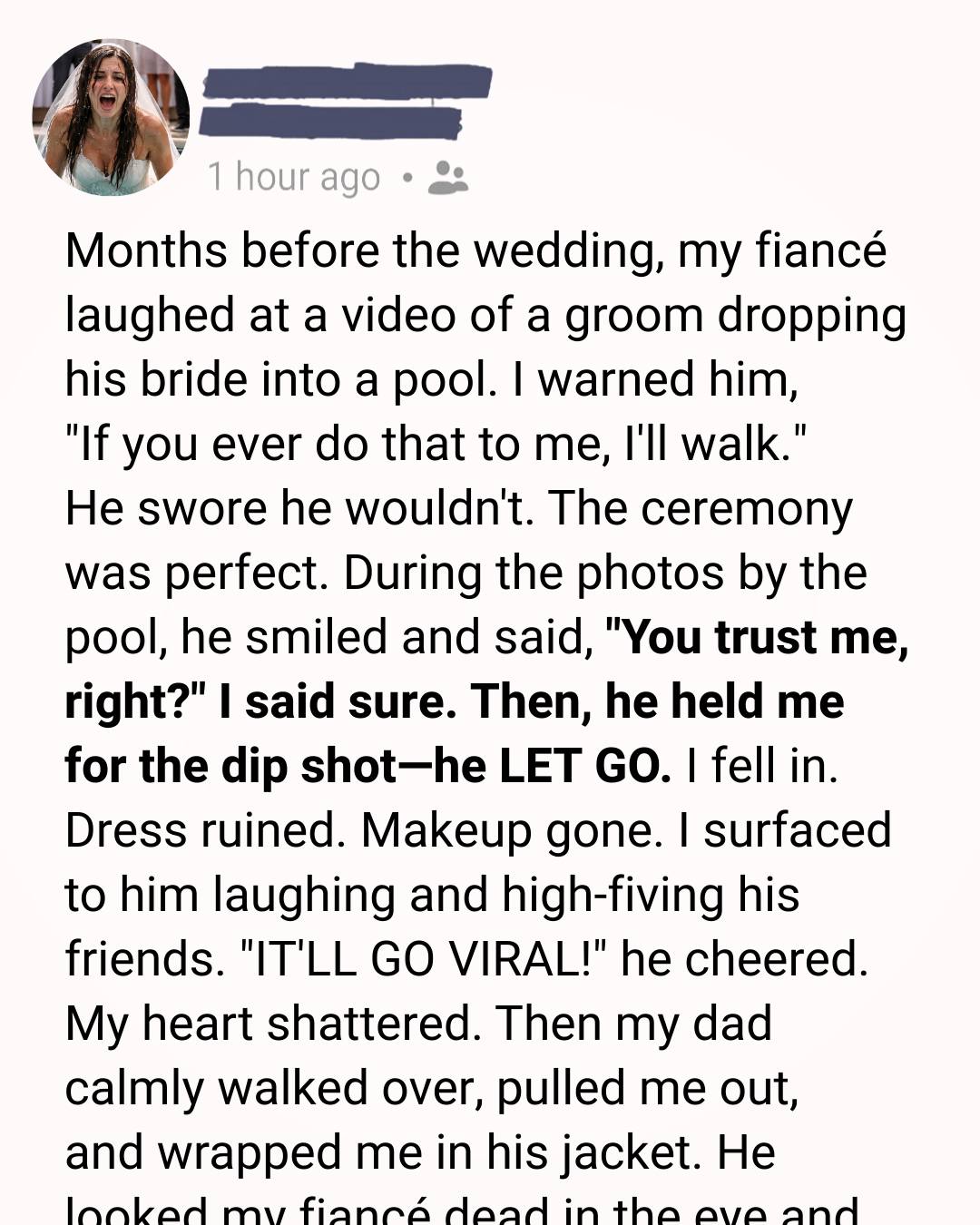 A groom had just dropped his bride into a pool during their wedding photos. Her guests screamed. The comments were exploding.