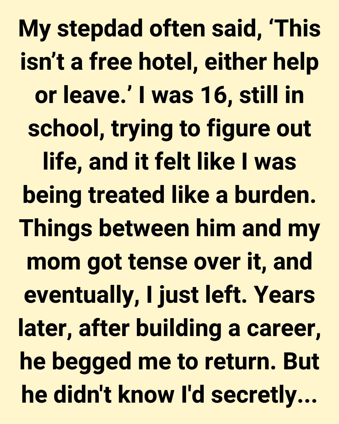 When I was a teenager, my stepdad had this line he loved to throw at me: “This isn’t a free hotel—either help or leave.” I was sixteen, still in school, just trying to figure out life, and it felt like I was being treated like a burden. Things between him and my mom grew tense because of it, and eventually, I decided to leave. I worked my way up, built a decent career, and stayed independent.