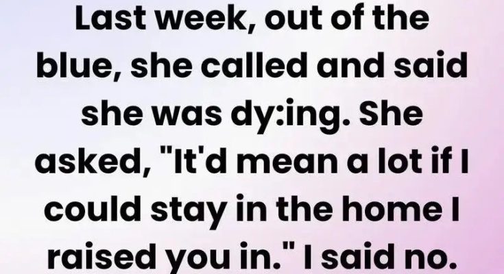 She stated that she was terminally ill and wanted to “fix things” before moving back into my home. She continued: “It would mean a lot to stay in the home I raised you in.” I declined, telling her, “You did not raise me.” “You left.” She cried, accusing me of being harsh. That I am her only child.