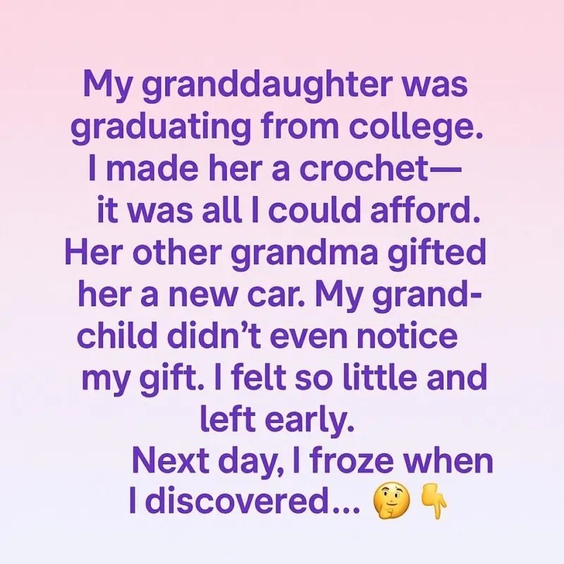 My granddaughter was graduating from college. I made her a crochet blanket — it was all I could afford. Her other grandma gifted her a brand-new car.