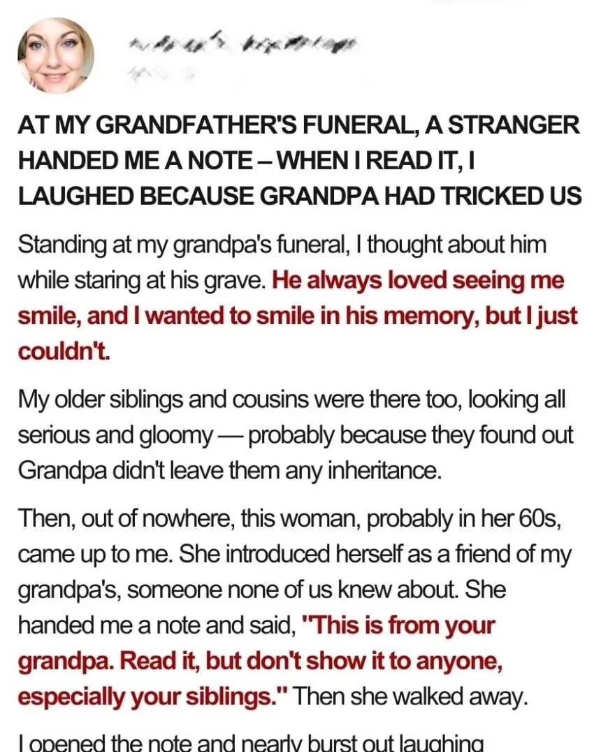 “I was a friend of your grandpa’s,” she said, leaning in as if we were co-conspirators. “He asked me to give you this.”