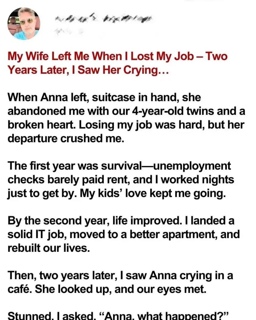 Two years ago, my wife walked out on me and our kids during the worst point in my life. After struggling and finally picking my family up again, I spotted her in a café, alone and in tears. What she said next completely blindsided me.