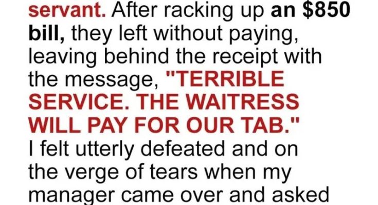 A family dined at our restaurant and treated me like their personal servant. After racking up an $850 bill, they left without paying, leaving behind the receipt with the message, “TERRIBLE SERVICE. THE WAITRESS WILL PAY FOR OUR TAB.”