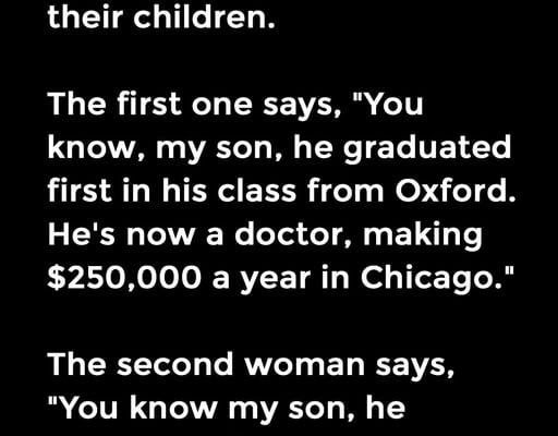 Three women were sitting around and bragging about their children. The first one says, “You know, my son, he graduated first in his class from Oxford. He’s now a doctor, making $250,000 a year in Chicago.”