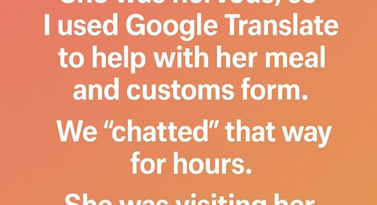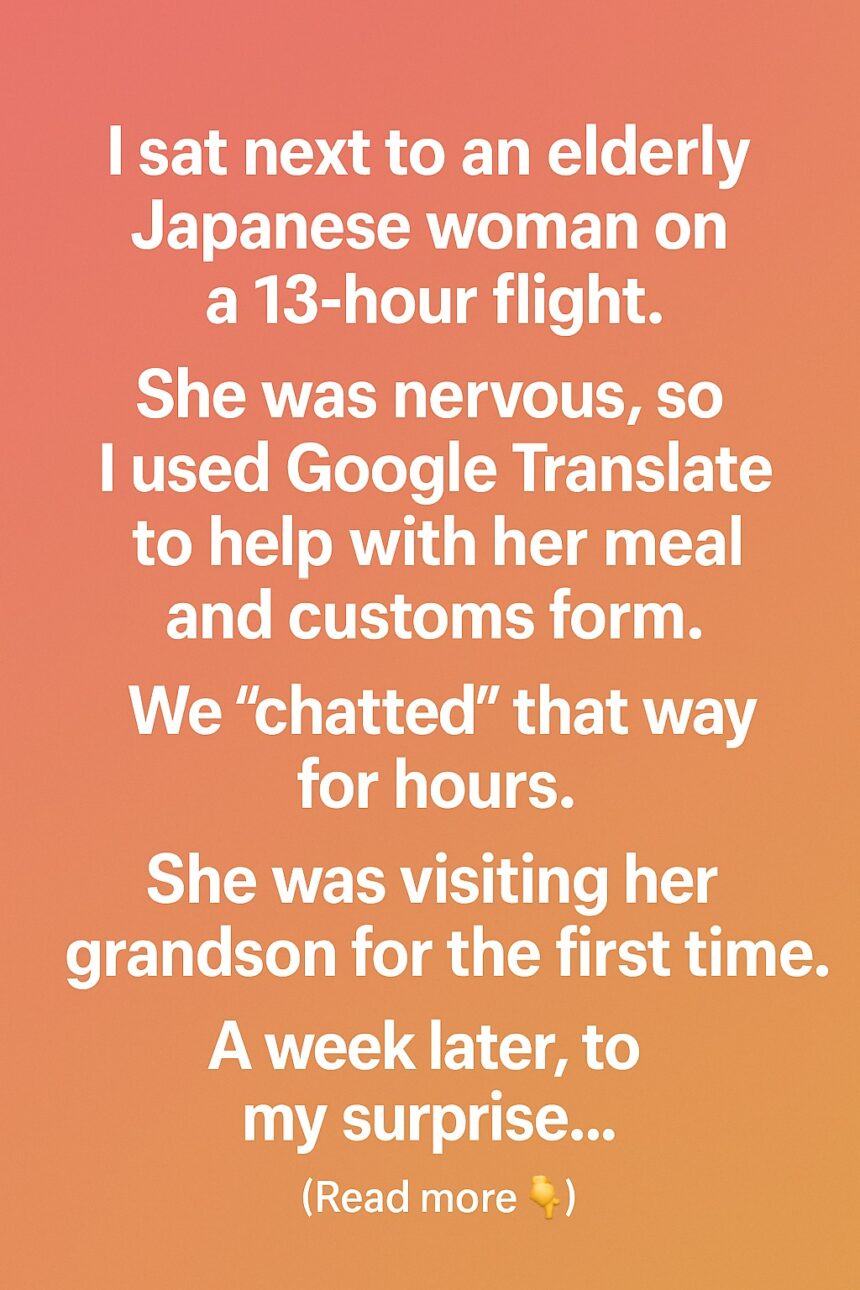 She looked nervous and a little overwhelmed, so I opened Google Translate and typed simple phrases to help her order her meal and fill out her customs form. Her eyes lit up with relief, and soon we were “chatting” back and forth, passing my phone between us. For hours, we shared bits of our lives—she told me about her small town in Japan, and I told her about my family back home.