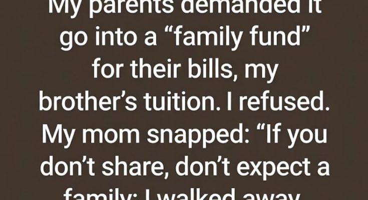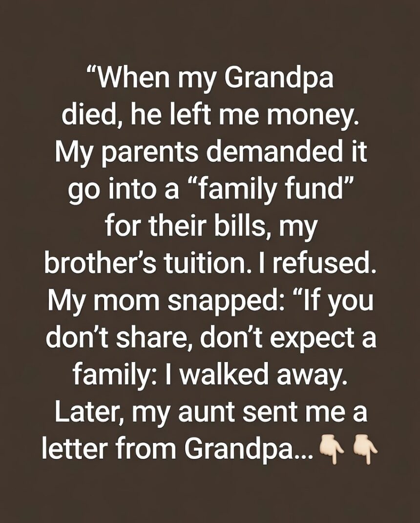 When my Grandpa passed on, he left me money. My parents insisted it should go into a “family fund” for their household expenses and my brother’s tuition. I chose not to agree, and my mom reacted with frustration, telling me that I wasn’t being supportive.