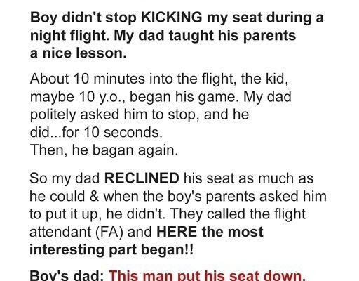 Suddenly, the kicking stopped for good. The father kept his seat reclined for a while longer, ensuring the parents understood the discomfort their child had caused. By experiencing inconvenience firsthand, they finally recognized the importance of being considerate toward others.