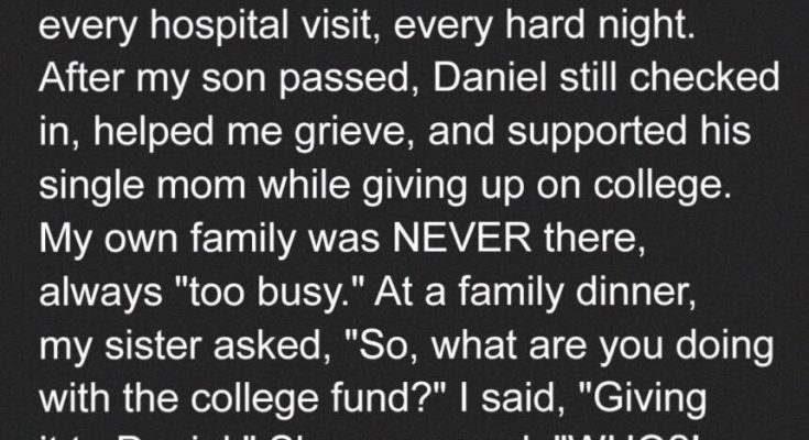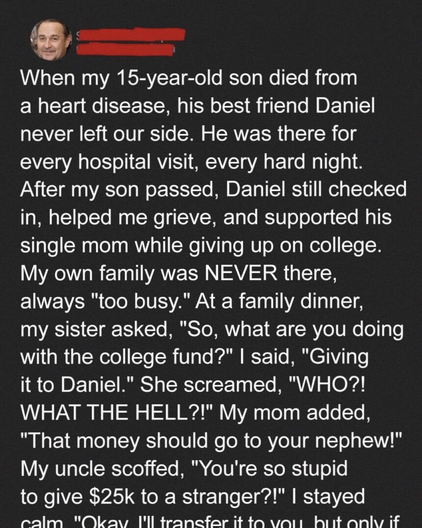 My own family was NEVER there, always “too busy.” At a family dinner, my sister asked, “So, what are you doing with the college fund?” I said, “Giving it to Daniel.” She screamed, “WHO?! WHAT THE HELL?!” My mom added, “That money should go to your nephew!” My uncle scoffed, “You’re so stupid to give $25k to a stranger?!” I stayed calm. “Okay, I’ll transfer it to you, but only if,” I said slowly, “you tell me the last time you visited my son in the hospital.