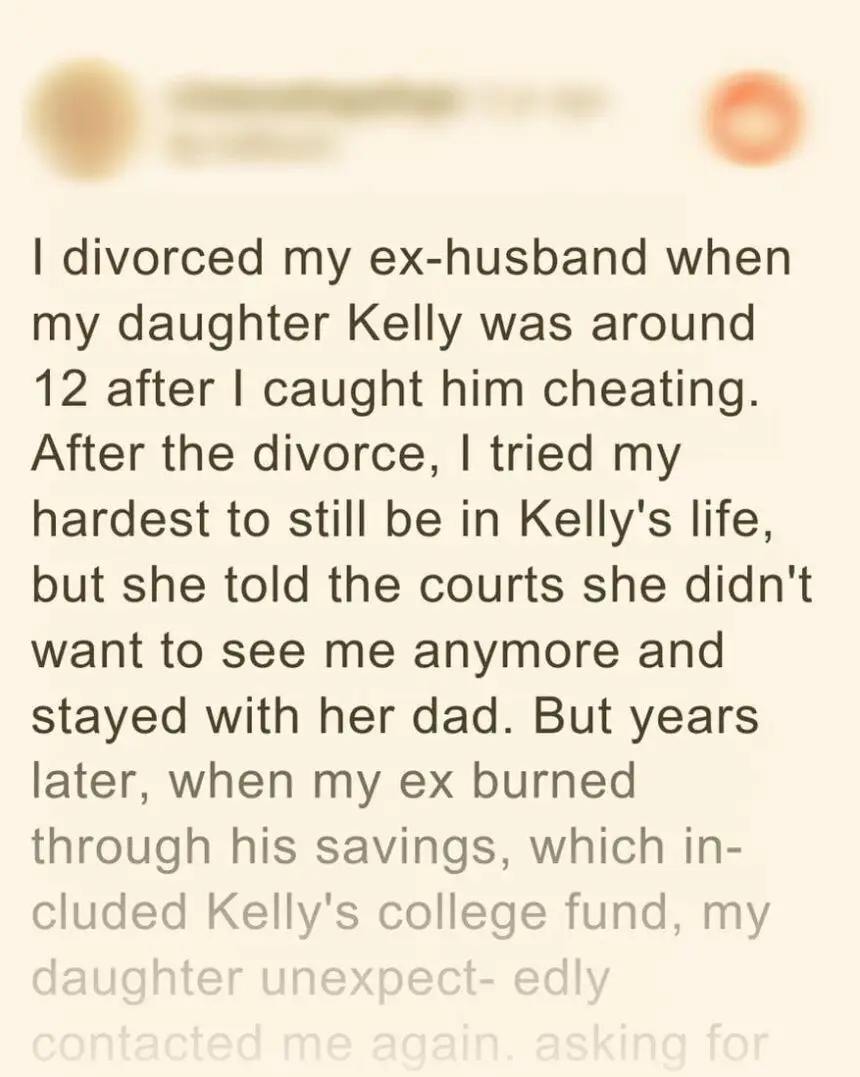 When a woman chose to divorce her husband over his infidelity, she lost custody of her daughter. As time passed, the daughter refused to see the woman, believing she was a bad person. It wasn’t until the girl had no more money to pay for college that she reconnected with her mom.