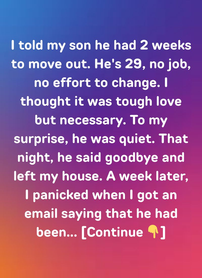 I told my son he had two weeks to move out. He’s 29, no job, no real effort to change. For years I’d paid his bills, stocked his fridge, and watched him sleep till noon.