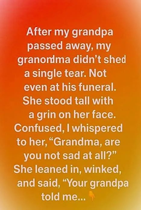 Not even at his funeral did she cry. My grandma stood tall with calm strength and a gentle smile. Confused, I whispered, “Grandma, aren’t you sad?” She leaned closer, winked softly, and said, “Your grandpa told me not to cry for him, but to live for him.”