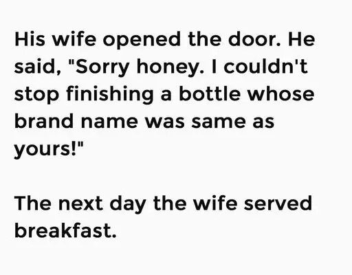 The next day the wife served breakfast. The man complained, “Oh honey, there’s so much salt in this dish…”