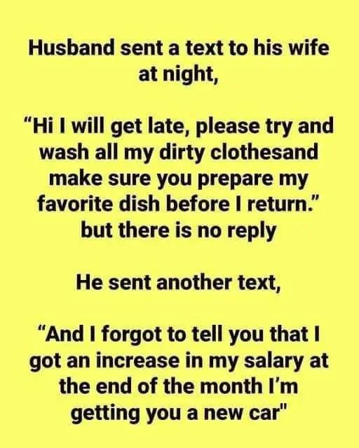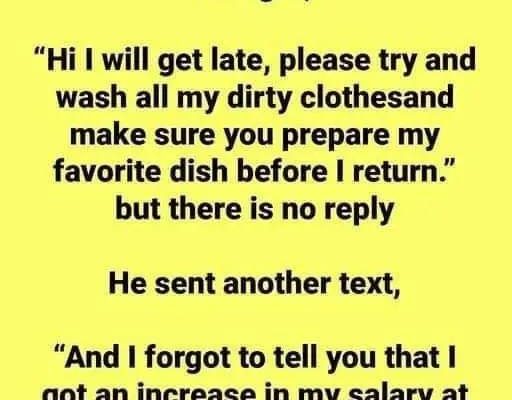 Late one night, a husband sent a text to his wife, requesting her to wash his dirty clothes and prepare his favorite dish before he returned home. Surprisingly, there was no reply.