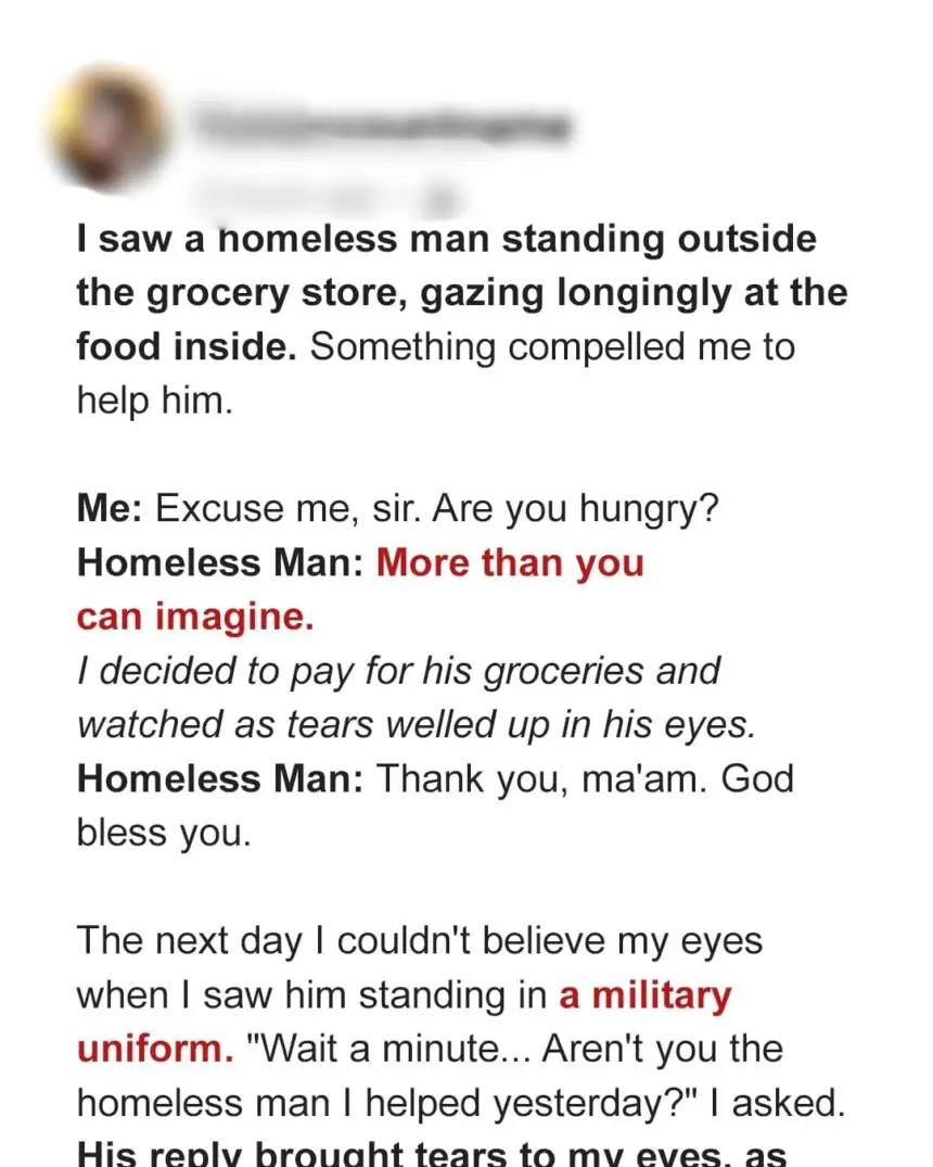 The straight-backed man in the crisp military uniform couldn’t possibly be the same person I’d helped yesterday. But those eyes… I recognized them immediately.