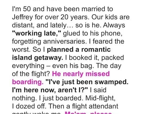 On a flight meant to reconnect with my distant husband, I woke not to turbulence, but to a flight attendant gently shaking my shoulder. “Your husband asked me to let you know he stepped away,” she said. Then, more quietly: “You should check his bag.” Her tone carried weight I couldn’t ignore.