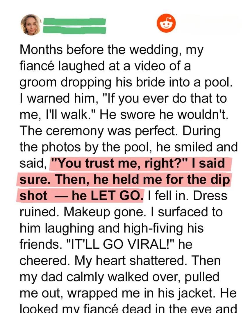 When Claire’s wedding turned from dream to disaster, one moment shattered everything she believed about love and trust. But sometimes, it’s quiet strength — not grand gestures — that saves us. Months before the big day, Dylan showed Claire a video: a groom tossing his bride into a pool.”If you ever do that to me,” Claire warned, “I’ll walk away.” He laughed it off.