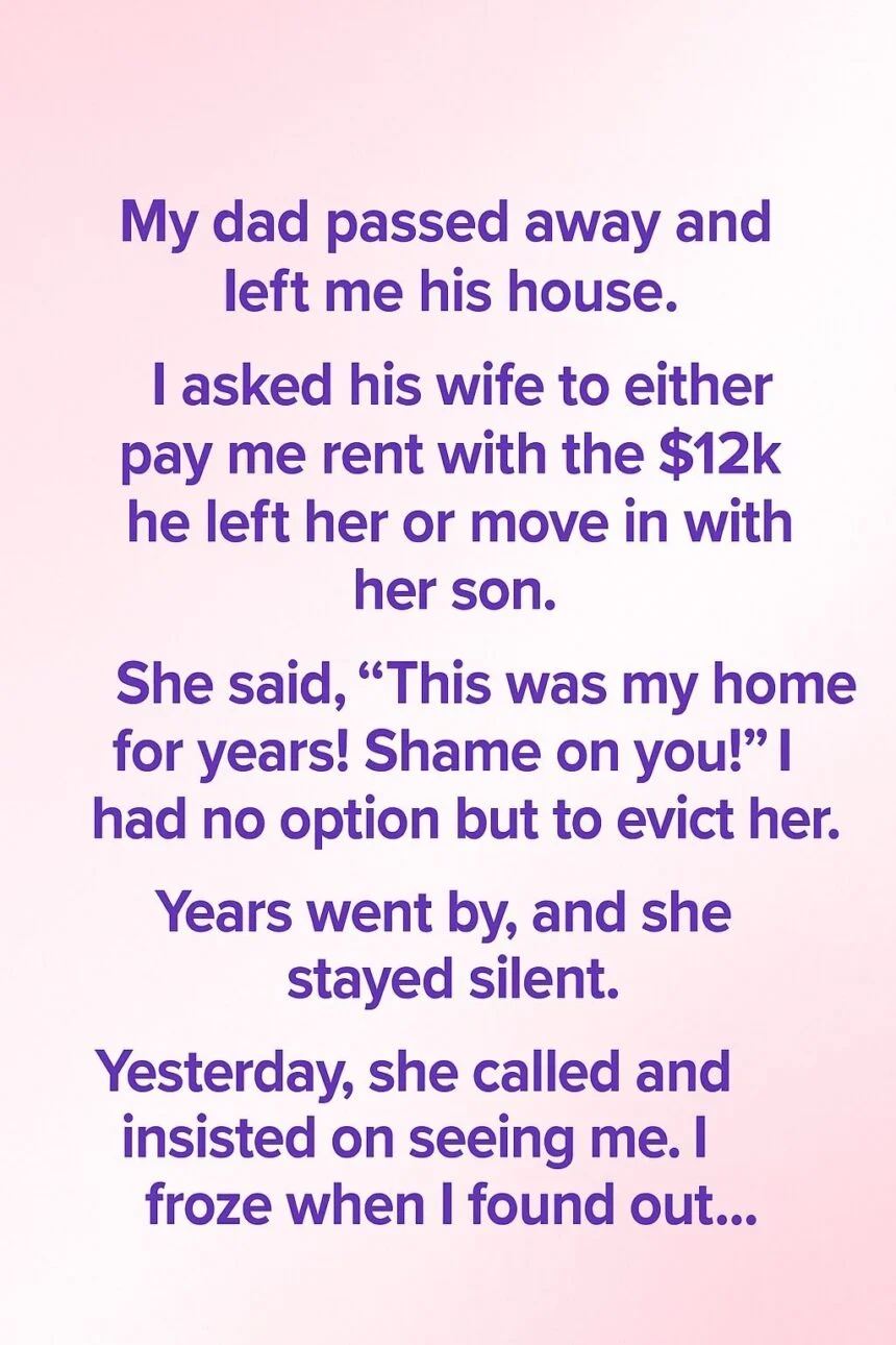 When my father passed away, he left me his house. His wife — my stepmother — stayed there, and I asked her to either pay rent using the $12,000 he left her or move in with her son. She glared at me and said, “This was my home for years!