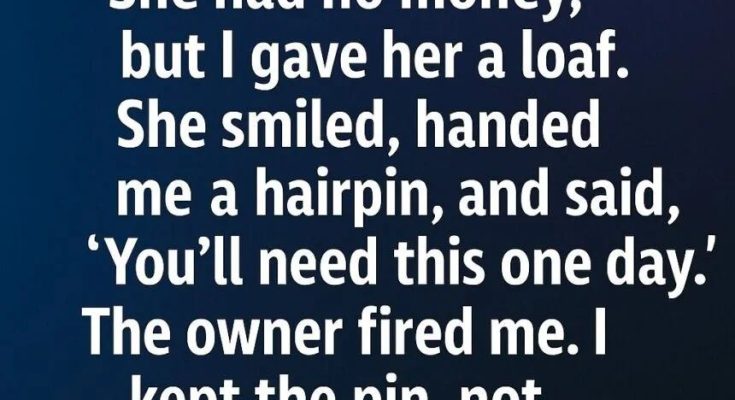 A pregnant woman once came into our bakery, begging softly for a loaf of bread. She had no money, but something in her eyes made me reach for a fresh loaf and hand it to her. She smiled, placed a delicate hairpin in my hand, and whispered, “You’ll need this one day.” Moments later, my boss found out and fired me for giving away food.