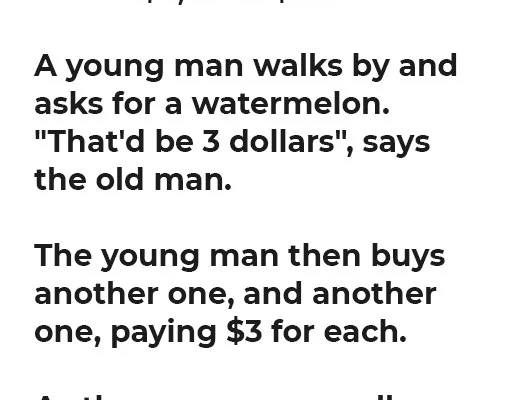 “That’d be 3 dollars”, says the old man. The young man then buys another one, and another one, paying $3 for each. As the young man walks away, he turns around, smiles, and says, “Hey old man, do you realize I just bought three watermelons for only $9?