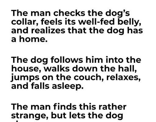 The man gets curious and puts a note on the dog’s collar: “Your dog takes a nap at my house every day. The next day the dog comes back with another note on its collar: “He lives in a house with four children – he is trying to catch up on his sleep. …