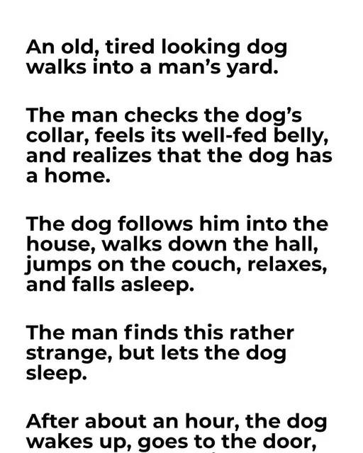 An old, tired looking dog walks into a man’s yard. The man checks the dog’s collar, feels its well-fed belly, and realizes that the dog has a home. The dog follows him into the house, walks down the hall, jumps on the couch, relaxes, and falls asleep.