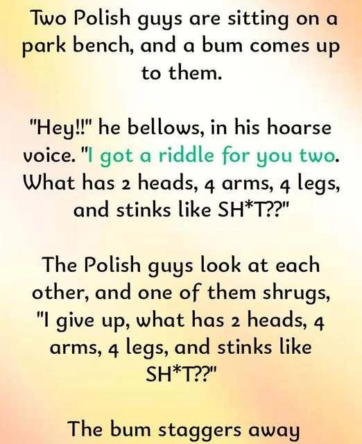 The Polish guys look at each other, and one of them shrugs, “I give up, what has 2 heads, 4 arms, 4 legs, and stinks like SH*T??”