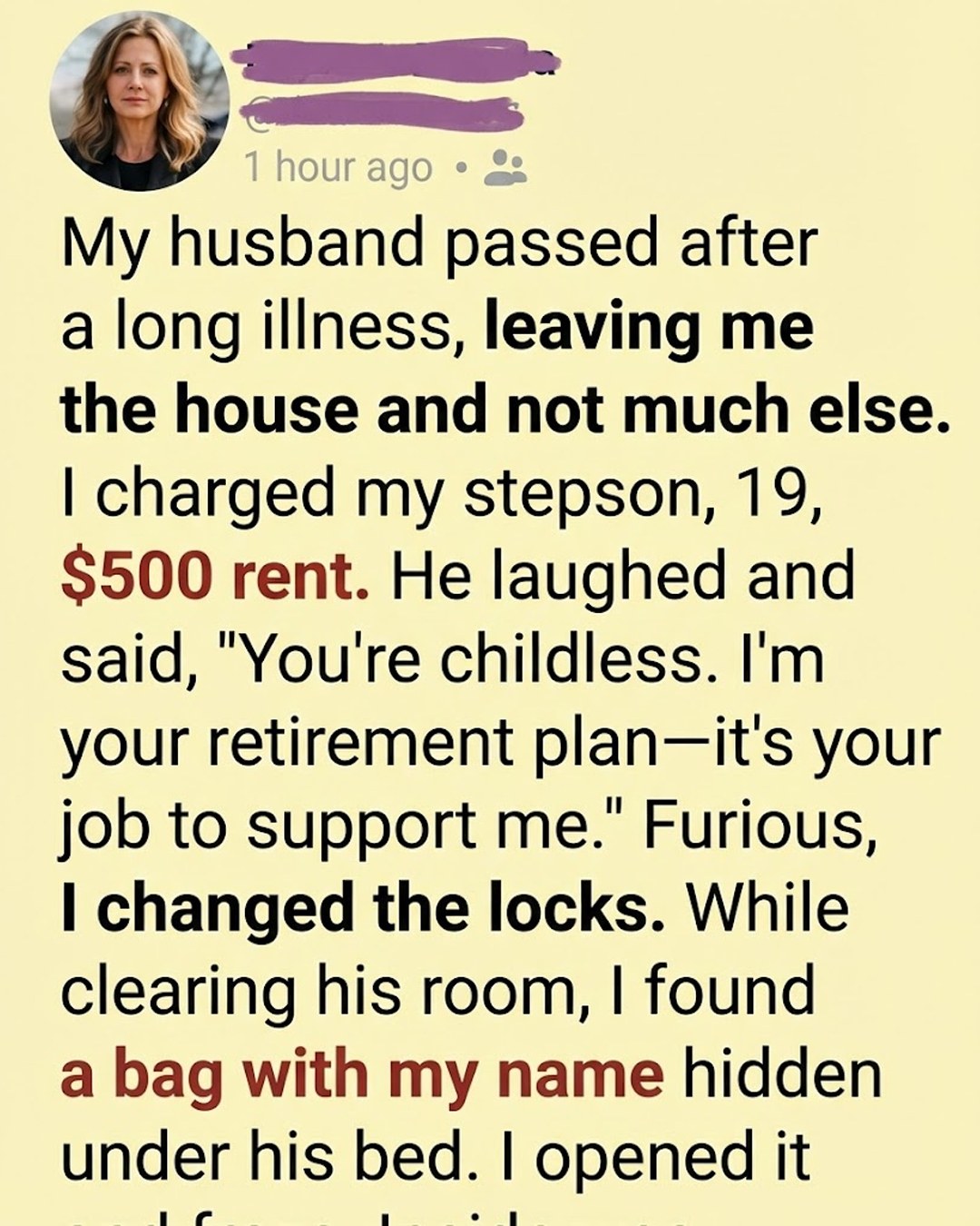 By morning, my grief had turned into resentment, convincing me he didn’t understand how serious our situation was. Acting on that pain, I began packing his belongings, preparing myself to tell him he needed to leave. While sorting through his room, I noticed a duffel bag tucked neatly under the bed, labeled with my name.