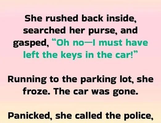 Panicked, she called the police, reported the car stolen, and even gave them the license plate number. Then came the hardest call of her life… to her husband. Stammering, she said, “Honey, the car’s been stolen.