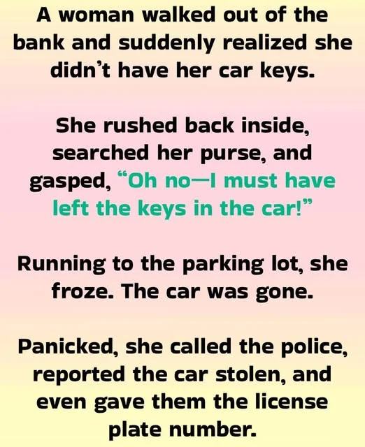 A woman walked out of the bank and suddenly realized she didn’t have her car keys. She rushed back inside, searched her purse, and gasped, “Oh no—I must have left the keys in the car!”