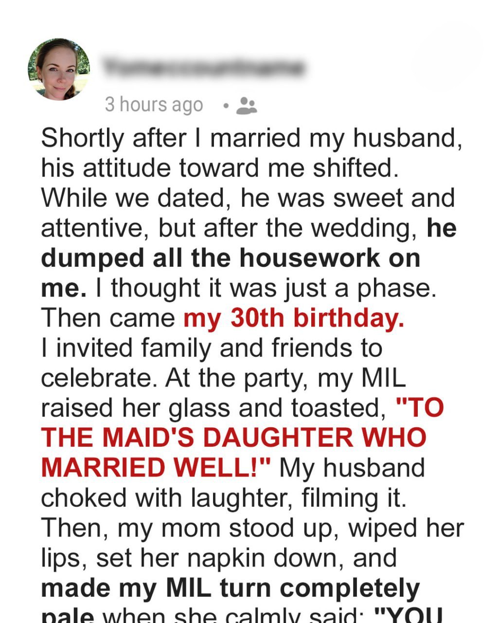 During my 30th birthday, my MIL raised a glass and sneered, “To the maid’s daughter who married well!” My husband laughed, filming it. The party froze — until my mom stood, calm and chilling, ready to reveal a truth that would shake the room and expose the cruel game they’d been playing.I was dead on my feet the evening I met my husband at a university alumni mixer.