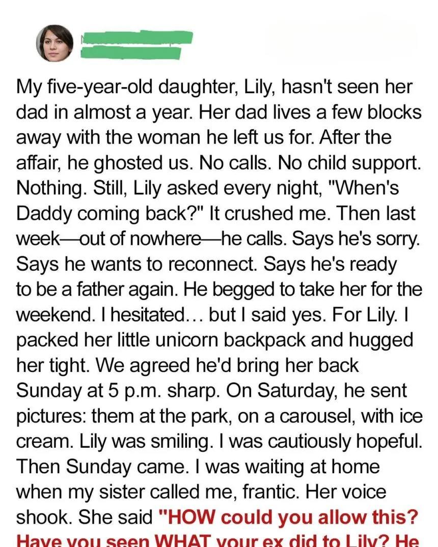 When my ex-husband, Leo, reached out saying he wanted to reconnect with our daughter, Lily, I felt something I hadn’t allowed myself to feel in years: hope. This was the man who had missed birthdays, school plays, doctor appointments, and every promise he ever made. Yet suddenly he wanted a weekend with her — “to make things right,” he said.