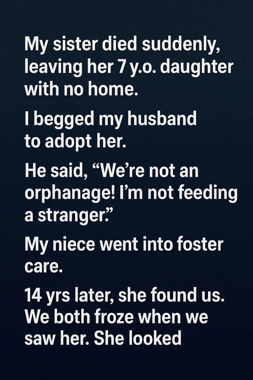 When my sister passed away unexpectedly, her sweet seven-year-old daughter was left with nowhere to go. My heart broke seeing her fear and confusion, so I turned to my husband and asked if we could take her in. He hesitated, saying we weren’t ready for such a big responsibility.