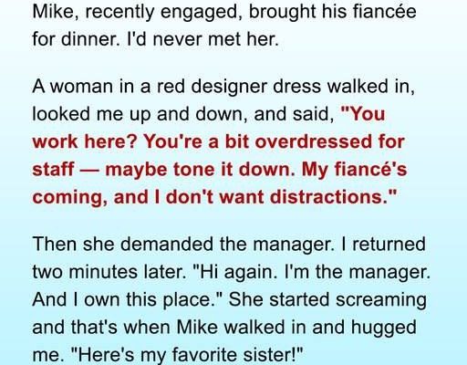 I smiled calmly. “Your fiancée asked me to change my outfit and hair and get someone else to serve her because she didn’t want any ‘distractions’ near her table.”