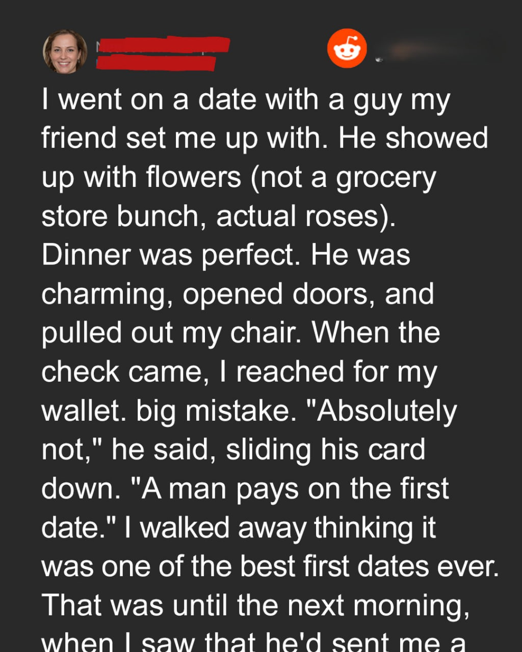 When Eric insisted on paying for our first date, I thought I’d met a true gentleman. Roses, a sweet gift, charming conversation — he was checking all the boxes. When he texted me the next day, I expected a cute follow-up, but my stomach dropped when I read his message.My best friend, Mia, meant well when she offered to set me up on a date, but her skills as a matchmaker were completely untested.