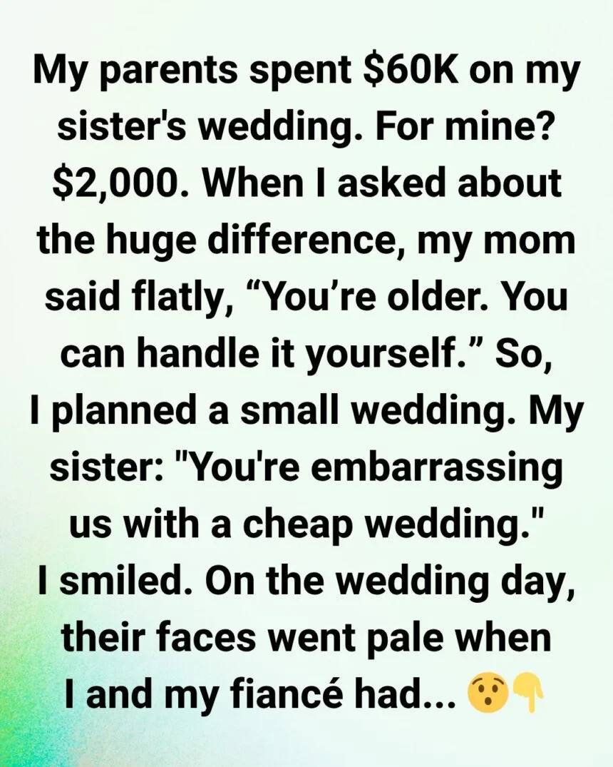 My parents spent $60,000 on my sister’s wedding three years ago. When I got engaged last year, I naturally assumed they’d help me out the same way. Instead, they handed me a check for $2,000.